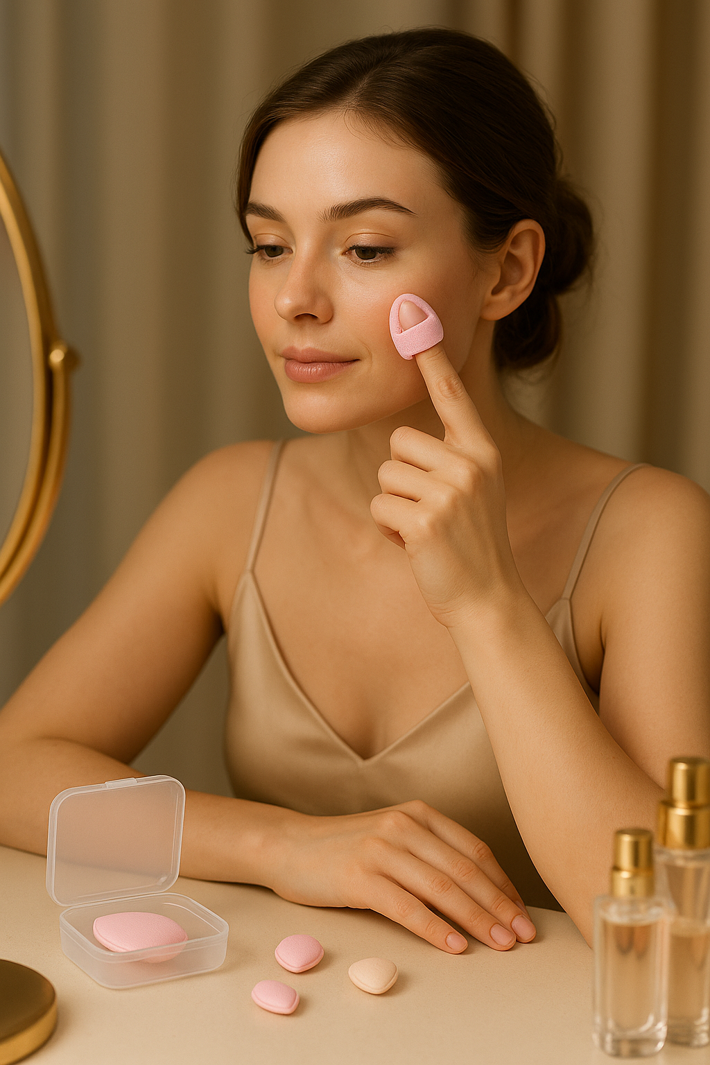 The Fingertip Flawless Puff™ is a soft, ultra-fine powder sponge created to help you blend foundation, concealer, and setting powder with ease. Designed to fit comfortably on your fingertip, this mini blending puff gives you maximum control, seamless coverage, and mess-free touch-ups throughout the day.